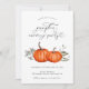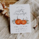 Fun halloween, carta de invitación a fiestas temáticas con ilustracion acuarela de calabazas con vegetación. El texto dice "por favor, únanse a nosotros para un fiesta tallador de calabaza".