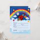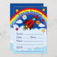 Invitaciones para la fiesta del cohete espacial para cualquier ocasión. Brillante cohete rojo espacial que atraviesa nubes blancas esponjosas para volar sobre algunos planetas felices y un arcoíris de colores brillantes y estrellas. Utilice la invitación tal como está o reemplace el texto en cualquiera de las plantillas.