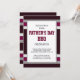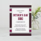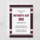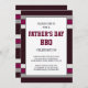 Este diseño atrevido y masculino presenta rayas rojas y grises en un fondo marrón rojizo. El texto del personalizable para el tipo de evento del Día del Padre (barbacoa, cocina, brunch, cena, fiesta, etc.) y la ubicación, RSVP y detalles de contacto aparecen dentro de una zona blanca con bordes dorados en el centro en la popular tipografía masculina roja y negra en la parte delantera de la tarjeta. La parte trasera de la tarjeta tiene las mismas franjas azul y beige.
