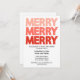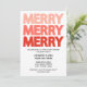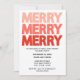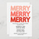 ¡Trae alegría moderna a tu reunión de vacaciones con esta atractiva invitación a la fiesta! El diseño presenta la palabra "MERRY" apilada tres veces en negrita, con letras en mayúsculas que cambian de un rosa suave en la parte superior a un rojo festivo profundo en la parte inferior, creando un divertido efecto ombré. Con un fondo blanco y limpio, el estilo minimalista pero llamativo facilita la lectura de los detalles del evento y la invitación, tanto contemporánea como festiva. Perfecto para fiestas de Navidades, celebraciones de feriados de oficina o reuniones familiares, esta tarjeta de personalizable le permite agregar su propia fecha, hora, ubicación y detalles de RSVP. ¡Una forma sencilla y elegante de extender la alegría de las vacaciones!