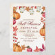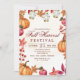 Invitación rústica a la fiesta del festival de la cosecha de otoño de acción de gracias con amigos, hojas que caen, manzanas, linternas y calabaza
