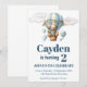 Invitación a la fiesta de cumpleaños del oso de peluche volando en un globo aerostático