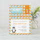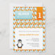 Una moderna invitación a la fiesta pingüina con un ilustracion de pingüino y un fondo geométrico de colores. Perfecto para el cumpleaños de un niño o fiesta de invierno.