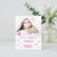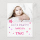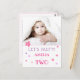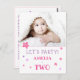 Tarjeta postal de invitación a la fiesta del segundo cumpleaños para niña o niño. Tarjeta de cumpleaños con foto adorable. La tarjeta tiene estrellas rosadas en la parte delantera y en la parte trasera. El diseño tiene una foto: inserte su foto en la plantilla y personalice la tarjeta con sus datos. Invite a su familia y amigos a la fiesta del segundo cumpleaños de su niña o niño.