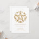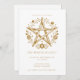 Un pentáculo rústico de madera, entrelazado con vibrantes flores, está en el corazón de esta invitación a la fiesta del solsticio con tipografía de oro. Un estilo bohemio rústico para su celebración Yule.