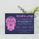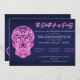 Calavera de azúcar rosa neón sobre un fondo de ladrillo oscuro - esta invitación es una de nuestras favoritas para una despedida de soltero/a, cumpleaños, fiesta de Halloween o incluso una boda temática. ¡Puedes personalizar la invitación con los detalles de tu evento!