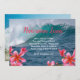 Plantilla de invitación a una fiesta hawaiana Luau. Fondo de olas del océano rompientes y diseño de flores de plumeria rosadas. Un gran título de fiesta con letra cursiva rosa oscuro en la parte superior del papel horizontal es para el título de la fiesta. Toda la información está impresa en blanco sobre el fondo de agua del océano azul oscuro. Las flores de frangipani están en las esquinas. El tipo de fiesta es fácil de cambiar para cualquier celebración de fiesta tropical.