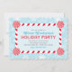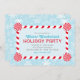 El diseño de la invitación de vacaciones con temática invernal incluye un marco de caña de caramelo de menta roja y el fondo tiene un patrón de copos de nieve. Los colores azul hielo, turquesa, rojo y blanco.