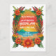 Invitación colorida a una fiesta reggae con una puesta de sol en la isla rodeada de flores tropicales