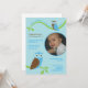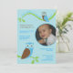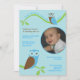 Invitación de primer cumpleaños de un personalizado con búhos azules modernos sentados en las ramas de los árboles. También se puede utilizar como anuncio de nacimiento.