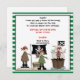 Invitación a la fiesta de cumpleaños de los niños piratas que incluye un barco pirata con bandera pirata Skull y Cross Bones, un cofre pirata del tesoro y algunos niños piratas lindos, uno con un gancho y un loro en el brazo, otro con un mapa del tesoro y una espada y todos con parches en los ojos. Alrededor hay un borde a rayas con rayas verdes y blancas. Un diseño adorable perfecto para cualquier niño que escoja un tema pirata para su fiesta. Negro, marrón, rojo, blanco, verde, azul, beige.