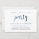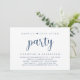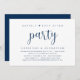 Tarjeta de invitación de fuga de novios con tema de escritura en azul marino moderno (Fiesta Feliz para Siempre). Es perfecta para la recepción de fuga de novios / fiesta de celebración después de la boda. Agrega tus detalles en fuente / letra negra a juego.