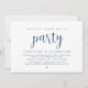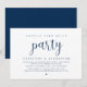 Tarjeta de invitación de fuga de novios con tema de escritura en azul marino moderno (Fiesta Feliz para Siempre). Es perfecta para la recepción de fuga de novios / fiesta de celebración post boda. Agregue sus detalles en fuente / letra negra a juego.