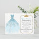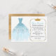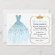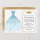 Glamorosa invitación a la fiesta de cumpleaños de Quinceanera con gráficos de un lujoso vestido de gata acuamarina, sobre un fondo blanco. En la parte derecha de la invitación, un espacio de texto decorativo con motivos dorados está decorado con una corona dorada en la parte superior. La parte trasera de las invitaciones se hace con un toque dorado. Personalice el texto para el día especial de su hija.