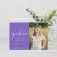 Esta invitación a graduarse presenta un fondo morado para representar los colores de tu escuela. Añade una foto y un texto personalizar en la parte delantera y posterior para incluir todos los detalles de tu fiesta de graduación. Esta invitación está disponible en una variedad de colores. Visita mi colección de graduaciones para ver todas las opciones.