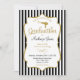 Una elegante invitación a la invitación de graduación de Cosmetology en negro y oro con un marco de acento falso purpurina dorado y rayas blancas y negras con texto en oro y negro y un secador de purpurina dorado. Esta elegante invitación de graduación de Cosmetology es una forma linda y divertida de invitar a sus invitados a su gran día.