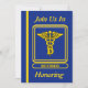 Esta invitación azul y dorada está decorada en el frente con el escudo caduceus del dentista retirado. Puede personalizar esta tarjeta colocando su información en los cuadros proporcionados.