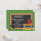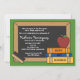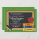 Una pizarra con un mensaje escrito en tiza explica los detalles de la jubilación de un profesor. La invitación está adornada con libros, una manzana roja y un borrador. Un dulce diseño de retiro para una profesión honorable.