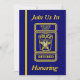 Esta invitación azul y dorada está decorada en el frente con el logo de la insignia de personalizado del Jefe de Policía. Puede personalizar esta tarjeta colocando su información en los cuadros proporcionados. También se puede personalizar la insignia en la parte delantera y trasera con el nombre del honorario.