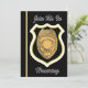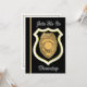 Esta invitación a la jubilación está decorada en la parte delantera con una insignia de teniente de policía dorada y las palabras "Únete a nosotros en honor".