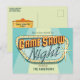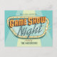 Tarjeta postal de invitación a la Noche de Programa de Juegos con un letrero tipográfico de "Noche de Programa de Juegos". Este diseño incluye elementos de azul, amarillo, rojo y naranja, un podio de programa de juegos, letrero luminoso y elementos inspirados en programas de juegos retro. Los productos incluyen una plantilla para personalización personal.