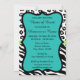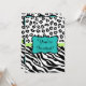 Personalizar esta sofisticada invitación para su fiesta, almuerzo, cena, reunión u otro evento. El diseño combina rayas de cebra negras y blancas con pieles de leopardo (guepardo). Un emblema azul turquesa verde azulado delineado en negro se sienta en una barra verde lima y crea un área de personalización, con palabras "Estás invitado" que se pueden personalizar a otras palabras. La parte posterior de la invitación incluye campos para toda la información del evento. Puede cambiar y eliminar campos fácilmente según sea necesario. Los colores son blanco, negro, turquesa y verde limón. Las pieles de animales salvajes para el diseño gráfico es una de las tendencias artísticas y de diseño más populares, y es muy popular desde la moda hasta la decoración doméstica. Esta sofisticada colección de huellas de cebra y leopardo es una de las varias combinaciones de colores disponibles para su elección de invitaciones. ¡Descansa con estos diseños de piel salvaje!