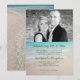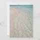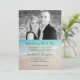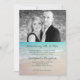 Anuncio de matrimonio y invitación solo para la recepción con un tema de playa / tropical. "Presentamos al Sr. y la Sra." es la línea superior debajo de la gran foto de los recién casados. La imagen del agua del océano azul y la arena de la playa es el fondo para fuentes grandes de escritura y pequeñas letras mayúsculas impresas. Primero, anuncie la fecha y el lugar del matrimonio, luego invite a los invitados a la recepción.