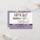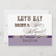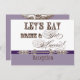 Fuentes elegantes y divertidas anuncian el mensaje "¡Comamos, bebamos y casémonos!" en un delicioso conjunto de invitaciones de boda caprichosas. En una paleta de colores limpia y crujiente de lavanda, ciruela púrpura, marrón chocolate y blanco es lo mejor de lo vintage con un toque moderno. El lado frontal tiene el texto y sus nombres con la fecha de la boda. En el reverso hay dos adornos de impresora con una fuente de caligrafía elegante y el símbolo ampersand y el texto "Celebren con nosotros" en fuentes únicas y divertidas junto con la información de la invitación a la recepción de la boda. Hay un conjunto completo de productos disponibles con este diseño y podemos hacerlo en cualquier combinación de colores que desee.