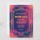 El "Radiant Reverie Invitation" capta el encantador espíritu de Diwali con una exquisita mezcla de elegancia tradicional y diseño moderno. En la parte delantera, una obra de arte elaborada enmarcada por un majestuoso arco, adornada con detallados motivos florales y geométricos que hacen eco de la belleza del antiguo arte indio. Estos motivos están adornados con un oro resplandeciente y tonos de cardenales profundos, creando un lujoso contraste con el vibrante fondo. El fondo de la invitación es un gradiente cautivador, empezando por el añil rico y el azul de medianoche en los bordes y pasando por los tonos azafrán y coral hacia el centro. Este efecto degradado simboliza la transición de la oscuridad a la luz, reflejando la esencia del Diwali, una celebración de iluminación y triunfo. La interacción de colores evoca un ambiente festivo y jubiloso, encarnando el espíritu de la ocasión. En el corazón del diseño, un motivo de pluma de pavo real bellamente detallado grava el fondo del arco. La pluma de pavo real, con su simbolismo de gracia, belleza y renovación, añade un toque de encanto real a la invitación. El espacio central dentro del arco está reservado para el texto de la invitación, con la opción de usar una tipografía elegante en blanco o oro que destacará llamativamente en el vibrante fondo. Este elemento de diseño garantiza que los detalles del evento sean tanto prominentes como estéticos. La portada trasera de la "Invitación a la recuperación radiante" continúa con el vibrante esquema de color, proporcionando amplio espacio para información adicional como mensajes personales o detalles de RSVP. El diseño cohesivo garantiza que la cubierta trasera complementa el frente, manteniendo el lujoso y festivo tema en todas partes. La "Invitación a la Reveridad Radiante" es más que una invitación; es una pieza de arte que celebra el Diwali con estilo y sofisticación. Las intrincadas obras de arte y los colores dinámicos ofrecen una fascinante introducción a una noche de festividad, lo que crea el escenario para una celebración memorable y alegre