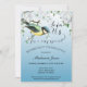Una hermosa invitación a la fiesta de retiro con temática de pájaro con un pájaro amarillo bonito en una rama con flores blancas y fondo de gradiente azul.