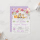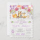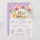 Invitación a la rociada de bebés con adorables acuarelas con animales de bosque rodeados de flores moradas y hojas verdes