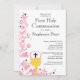 Nuestra elegante invitación floral a la Primera Santa Comunión es una invitación moderna y tradicional a la sagrada comunión. Nuestra invitación rosa y blanca presenta un bonito marco floral rosa con un cáliz y un eucaristí sagrado sobre un fondo blanco resplandeciente. La parte trasera de nuestro hotel tiene un color que se corresponde para un toque especial. Diseño moderno y fresco que impresionará a sus huéspedes. Invitación perfecta para una primera comunión sagrada. Visite nuestra tienda para obtener más opciones de color. ©Mujka ©Zenware Designs