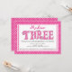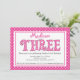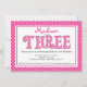 Empieza tu fiesta de tercer cumpleaños con nuestra adorable invitación de cumpleaños de chicas dulces. Nuestra encantadora invitación para el cumpleaños chica incluye la palabra "tres" en un patrón de puntos polka blanco y rosa caliente sobre un fondo blanco con un marco de borde punteado de polka rosa y blanca.