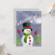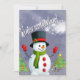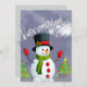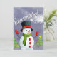 Este es un ilustracion digital con un lindo muñeco de nieve que quiere invitarte a una maravillosa cena de Navidades. Hay nieve con regalos y árboles de Navidad.