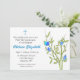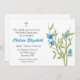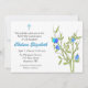 Invitación adecuada para la Primera Santa Comunión, Confirmación, Bautismo o Cristiandad. El diseño presenta un toque de flores azules y acento crucifijo. La invitación se puede personalizar fácilmente con los detalles de su evento y se completa con sobres.