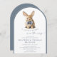 This elegant slate blue arched storybook Bunny Baby Shower Invitation features a watercolor illustration of a bunny wearing a blue bowtie, set within a modern arched frame. The design utilizes a muted slate blue and white color palette, combining elegant script with a mix of serif and sans-serif typography for a polished, boutique look. The arched frame and dusty blue hues create a timeless, elegant look. Personalize with your event details, and make gift-giving effortless with a QR code on the back linking directly to the baby registry. A beautiful and convenient way to invite loved ones to share in this special moment!