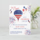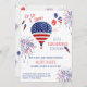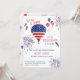 Up Up and Away a little firecracker is on the way! Fourth of July themed birthday invitation with hot air balloon, kite, balloons and fireworks in a patriotic color palette of red white and blue. Gender neutral, in red white and blue, for a little boy or little girl baby shower invitation and, perfect for a July celebration.