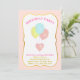 Tarjeta de invitación al 13º cumpleaños del corazón y los globos. Tres globos coloridos emergiendo de un corazón rosado sobre fondo blanco y rosa.