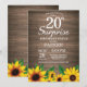 Invitación de cumpleaños número 20 de la Rustic Sunflower Surprise. Flores florales y fondo rústico de madera. Retro de cosecha de campo. Cumpleaños de las mujeres. 12.º 13.º 15.º 16.º 18.º 20.11.30.40.50.60.70.80.90.100, de cualquier edad. Digital Imprimible. Para una mayor personalización, haga clic en el botón "Personalizar" y utilice nuestra herramienta de diseño para modificar esta plantilla.