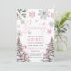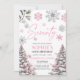 Siete invitaciones de cumpleaños con copos de nieve rosas y plateados y pinos. Ideal para tu fiesta de cumpleaños número 70.