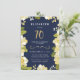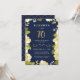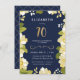 Esta elegante y distinguida invitación de 70 años presenta una frontera floral ilustrada y el número "70" en oro. El fondo es de color azul marino, pero puede personalizarse según el color que elija. La parte posterior de la invitación incluye un patrón de quatrefoil dorado con un fondo marino a juego que también se puede intercambiar. El texto es el personalizable para su evento especial de cumpleaños.