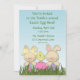 Invitación de Semana Santa con conejos conejitos, pollo y huevos sentados en el césped con fondo azul. La invitación puede ser personalizada para cacerías de huevos de Pascua, desayunos de Pascua, etc. Las invitaciones vienen con sobres y tu elección de papel.