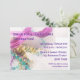 Invitación festiva para su fiesta Mardi Gras con coloridas cuentas, máscaras violetas y plumas. Fácil de personalizar con los detalles de su evento.