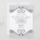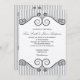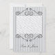 Esta invitación a la boda tiene un fondo claro de rayas grises y blancas, con torbellinos vintage en la parte superior e inferior. Los remolinos son negros sólidos. El reverso tiene una abertura para una foto de la pareja con un área debajo para sus nombres. Se muestra en papel metálico, pero puede imprimirse en cualquier material disponible.