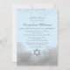 Una elegante invitación a Bat Mitzvah azul y plateado que incluye confetti purpurina plateado en la parte superior y glam plateado en la parte inferior con un purpurina de plata Star of David.