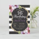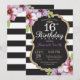 16a. Invitación de cumpleaños para mujeres. Invitación a la fiesta de cumpleaños negro y oro.Brillantina dorada. Flor floral color morado. Bandas blancas y negras.Pizarra. Digital Imprimible.