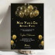 A New Year's Eve birthday party invitation with gold and silver balloons on a black background. Elegant font reveals event details, setting a festive tone.