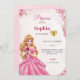 A pink princess-themed birthday invitation for Sophia's 5th birthday. The card shows a princess in a pink dress with floral accents.