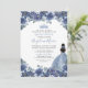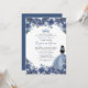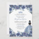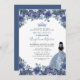 Elegante Invitación De Quinceanera Azul Floral. Rosas y flores de color azul polvoriento y azul marino adorables, mezcladas con hojas y follaje verde claro, constituyen el escenario de esta temática fiesta de Quinceañera. Un aspecto sencillo pero caprichoso con una variedad de tonos azules. Una mezcla de tipos de letra serif clásicos y una hermosa tipografía de guiones hacen que esto sea elegante y divertido. Una princesa azul brillante tiara chispa arriba y atrás, así como un adorable chica con un vestido azul brillante delante. Puede cambiar todos los colores del tipo de letra para hacerlo más colorido o vibrante si lo desea. También puede cambiar el fondo y la parte posterior del color de la invitación a lo que desee. Disponible en forma de invitación impresa, o como una invitación digital descargable que puede enviar por correo electrónico o que ha impreso localmente.