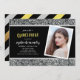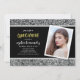 Purpurina de Plata Foto Invitación de Quinceañera con las palabras "Quinceañera" en un divertido tipo de letra sans serif en un falso Relieve metalizado de oro con un fondo de purpurina plateado arriba y abajo y un fondo de centro negro. La invitación tiene un patrón de rayas de Relieve metalizado de color gris, negro y falso oro en la parte trasera. Personalízalo reemplazando el texto del marcador de posición y reemplace la foto de ejemplo/marcador de posición por su propia foto. Para obtener más opciones, como cambiar el tipo de letra y su tamaño/color o el espaciado entre letras, haga clic en el botón "Personalizar". *Tenga en cuenta que la marca de agua Zazzle que aparece en la vista previa del zoom NO aparecerá en el producto impreso final. © Rosewood y Citrus